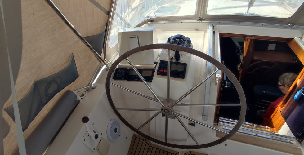 toplanma alanı olarak geniş ve konforlu, hem de teknenin kontrollerinin çoğuna hızlı erişim sağlamaktadır. İki adet dümen simidi sayesinde seyirler hem içeriden (pilot house) hem de dışarıdan (kokpit) yapılabilmektedir.
